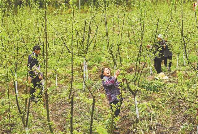 3月29日,石柱縣中益鄉,村民正在為木瓜樹苗修枝。