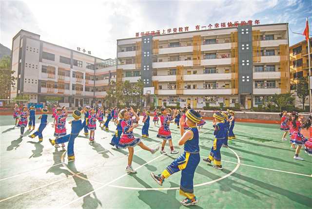 4月13日,石柱縣中益鄉小學,孩子們正在操場上練習土家族擺手舞。