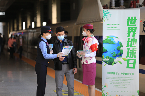 4月20日,乘務員向旅客宣傳環保知識。 郎志強攝