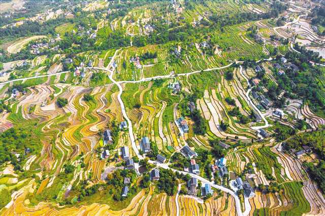 4月23日,綦江區郭扶鎮古松村,梯田、村莊、產業路繪就一幅美麗田園畫。