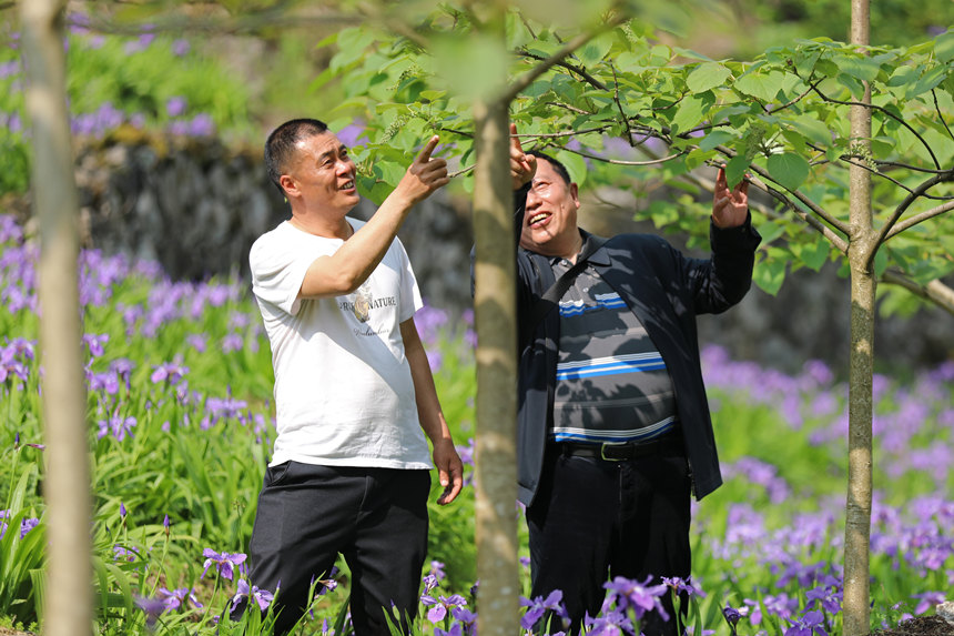 走進三合社區,除了林下田間一畦畦花開正艷的鳶尾花,山上長滿綠油油的喬木是毛葉山桐子樹,淡黃色的花朵成串掛在枝椏上,樹干上種植的鐵皮石斛,墨綠色的葉片中間開始抽出花芽。