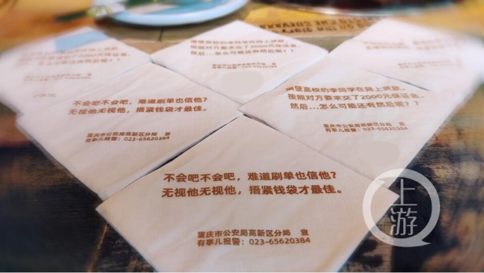 當第一次拿到這種特殊餐巾紙時,西部科學城重慶高新區公安分局虎溪派出所民警崔成玉感到又驚又喜:“公安的反詐宣傳工作,最希望能發動群眾力量。這樣的創意正是我們想看到和所需要的!