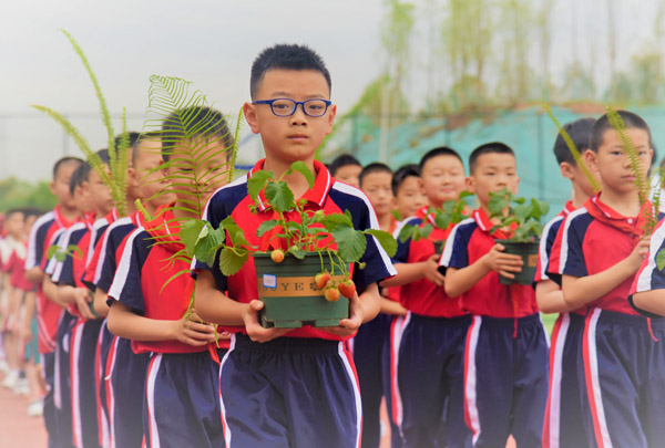 孩子手捧自己在未來田園實驗基地種植的植物入場。重師附二小供圖