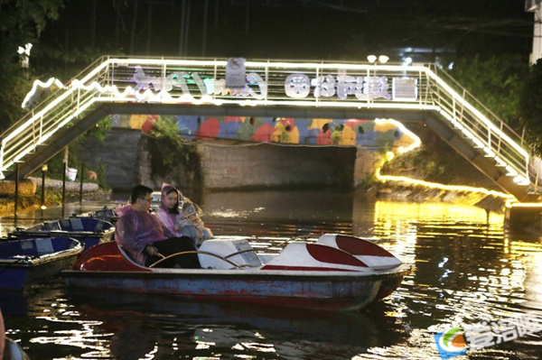 當晚的春雨給夜色蒙上一層神秘的面紗。乘上一艘腳踏船,水波蕩漾間,處處都是流光溢彩的美景。游客在游覽時既有現代都市的霓虹璀璨,又有鄉間田園的漁舟唱晚,一步一景,尤其是特色水上景觀長廊,增加了夜景燈光設計,在夜間游覽時有不一樣的槳聲燈影體驗。