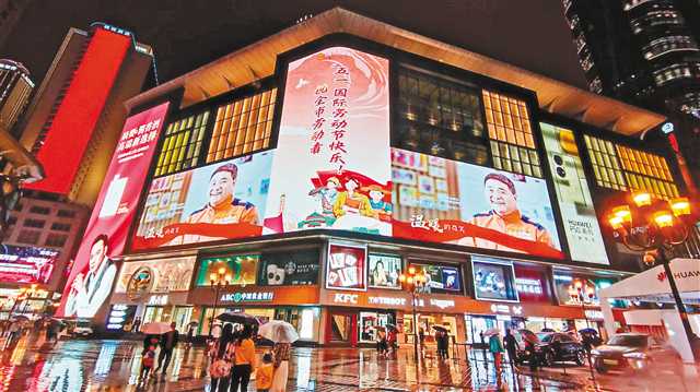 4月30日晚,我市在觀音橋、解放碑等商圈地標建筑的LED大屏幕上,向全市各行各業的勞動者致以節日的問候。(市總工會供圖)