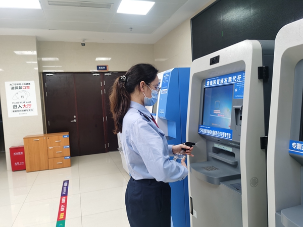 5月4號一大早,兩江新區稅務局的兩位稅務青年就來到辦稅服務廳,對自助設備進行消毒、裝票等工作,開始了一天的值班工作。