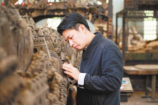 2014年,在父親的勸說下,周奎辭掉前途不錯的工作,返鄉向父親——周氏木作技藝第四代傳承人周成文學習木工雕刻。從此,他把木雕和古建筑當成了自己的愛好。