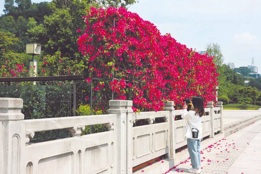 “同樣規模和形態的三角梅,在重慶觀賞可能會有更好的效果!绷温斎f,三角梅在山城有了更加立體的“舞臺”。首先,山城的地形比較豐富,容易形成小氣候環境,有助于三角梅生長。同時,山城的街頭路邊、公園、山城步道、立交橋兩側、坡坎崖、燈桿、建筑物外立面等諸多場景,都是三角梅的展示“舞臺”,市民的觀賞角度和范圍都更加豐富。