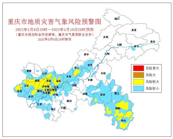 5月9日16時,重慶市規劃和自然資源局、重慶市氣象局聯合發布全市地質災害氣象風險預警。