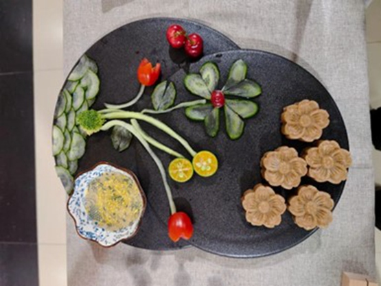 比賽現場,日常的湯羹、糕點、涼菜,通過護理人員的手,巧妙地加入芡實、通草、川貝等中醫藥元素,呈現出“郁金香伴”“太極四味”“益氣補血花膠雞湯”“荷塘爭艷”等極有創意、同時兼顧視覺美和味覺美的中醫藥特色美食,引得現場員工、患者紛紛駐足品嘗,并發圖分享到朋友圈,助力中醫藥文化傳播。