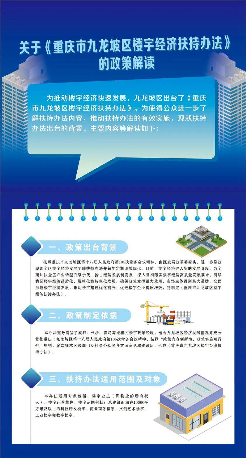 大力發展樓宇集聚區、鼓勵新建樓宇開發運營、鼓勵打造特色樓宇……近日,為加快全區產業轉型升級步伐、搶占經濟發展制高點,深入貫徹落實高質量發展要求,推進樓宇服務生態圈建設,引導九龍坡區樓宇經濟品質化、規;吞厣l展,九龍坡區根據全區經濟社會發展形勢和重點扶持行業領域變化情況,在對既有扶持辦法進行修訂完善后形成《重慶市九龍坡區樓宇經濟扶持辦法》(以下簡稱《扶持辦法》)。
