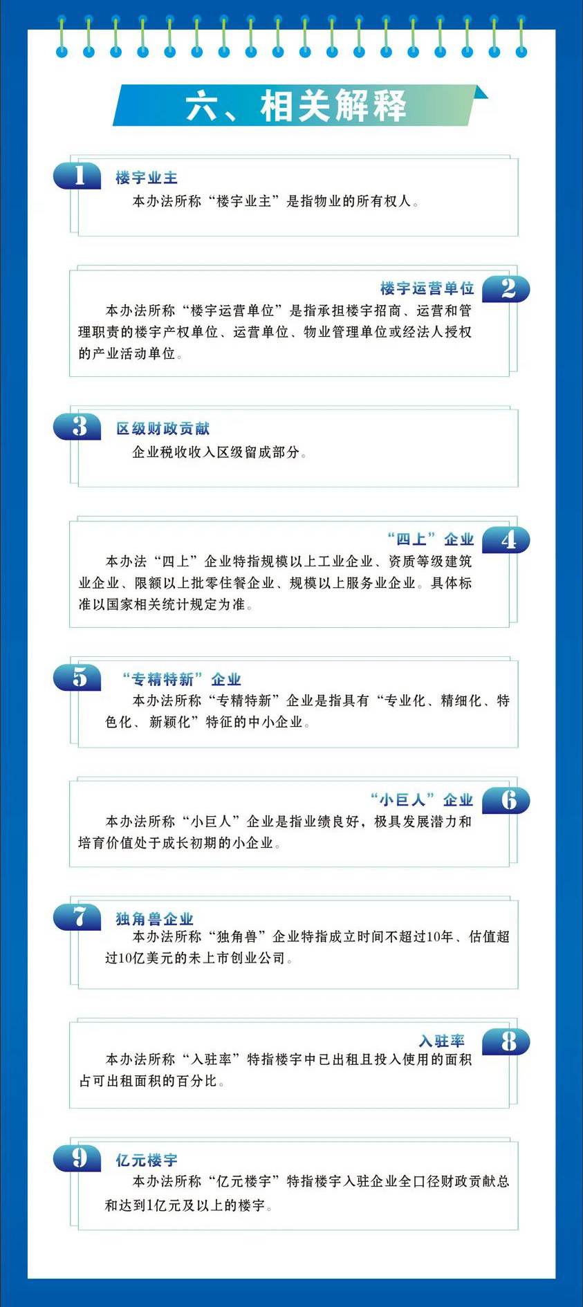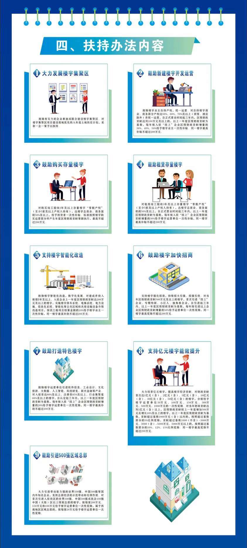 該《扶持辦法》適用對象包括:樓宇業主(即物業的所有權人)、樓宇運營單位。樓宇范圍包括:總建筑面積在10000平方米及以上的科技研發樓宇、商業商務樓宇、文創藝術樓宇、工業樓宇和數字樓宇。扶持政策包括大力發展樓宇集聚區、鼓勵新建樓宇開發運營、鼓勵購買存量樓宇、鼓勵租賃存量樓宇、支持樓宇智能化改造、鼓勵樓宇加快招商等9條政策。
