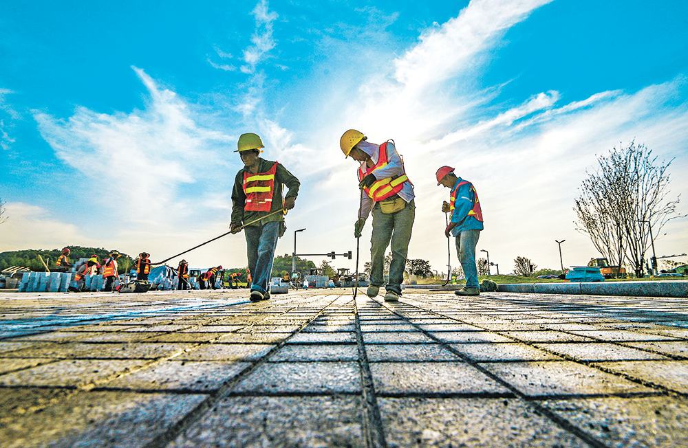 5月10日,西部(重慶)科學城白鷺公園一期項目施工現場,工人正在對地面石磚進行填縫。