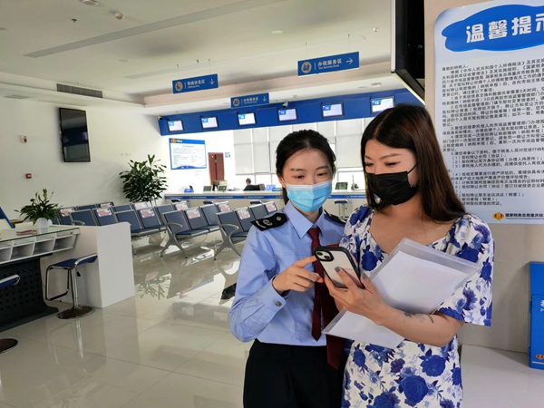 在沙坪壩區不動產登記中心,稅務人員輔導市民使用手機下載契稅完稅證明。張嘯攝
