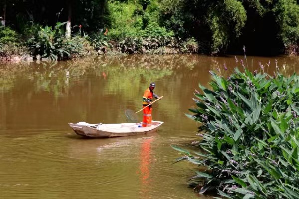 工作人員對榮峰河進行清漂。胥世鵬攝