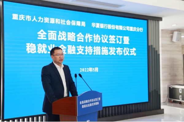 為凝聚政銀合力,推動落實金融支持穩企業保就業工作,5月20日,重慶市人力社保局和華夏銀行重慶分行舉行全面戰略合作協議簽約儀式,依托各自優勢,進一步提高合作層次、創新合作方式、拓寬合作領域,發布穩就業促就業專項金融支持等措施,撬動社會資本支持“穩就業”“保居民就業”。