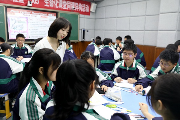 江北中學英語教師郭宇航在“365”生命化課堂同課異構課程展示上,為學生設計了一次音樂節活動的特殊課程,她用線上線下的方式招募表演者和服務志愿者,利用音樂強大的感染力,通過音樂節活動幫助他人。師生在海報設計、宣傳表達等環節產生了良好的互動,不僅把學科知識靈活運用,還將關愛生命的主旨融入其中。