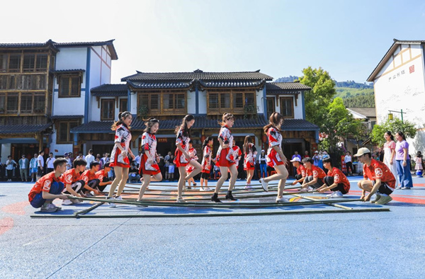 獵神三巷內,游客正在體驗跳竹竿舞。熊偉攝