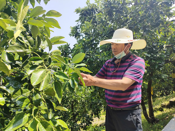 果農正在查看柚樹。梁平區委宣傳部供圖