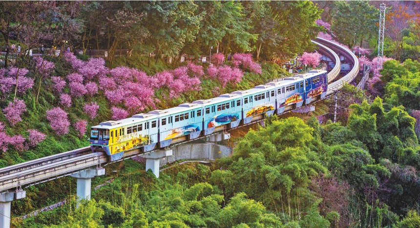 二月二十三日,軌道交通二號線渝中區佛圖關段,軌道列車穿行在花海中,成為一道亮麗的風景線。特約攝影 王正坤\視覺重慶