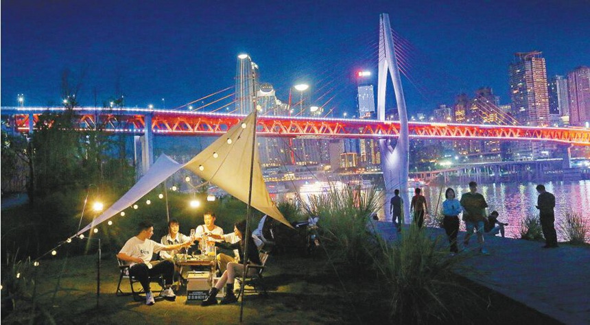 5月10日,千廝門嘉陵江大橋與江灘親水公園吸引市民前來露營、散步、賞景。近年來,隨著“兩江四岸”生態修復提檔升級,一個個綠色親水濱江公園相繼建成,給市民休閑健身提供了更多好去處。特約攝影 鐘志兵/視覺重慶