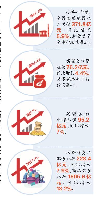 喜事連連的背后,是打造西部金融中心核心承載區和培育建設國際消費中心城市首選區的魄力和能力,是江北區主動挑起“兩副擔子”的底氣和決心。今年一季度,全區實現地區生產總值371.8億元、同比增長5.9%,總量位居全市行政區第三。實現全口徑稅收76.2億元、同比增長4.4%,總量保持全市行政區第一;實現金融業增加值95.2億元、同比增長7%;社會消費品零售總額228.4億元、同比增長7.9%,商品銷售總額1605.6億元、同比增長18.2%。