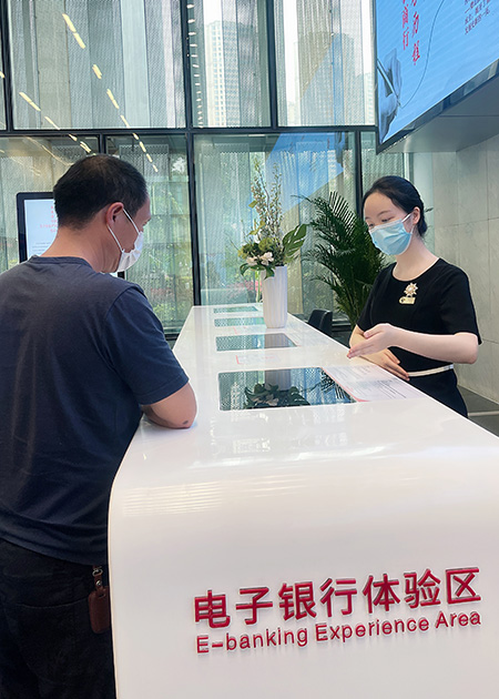 重慶農商行工作人員為客戶介紹該行國際業務線上服務平臺。重慶農商行供圖