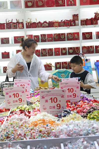 江北區觀農貿糧油批發市場“銀倫糖果鋪”,一名女士帶著孩子正在選購糖果。張睿攝
