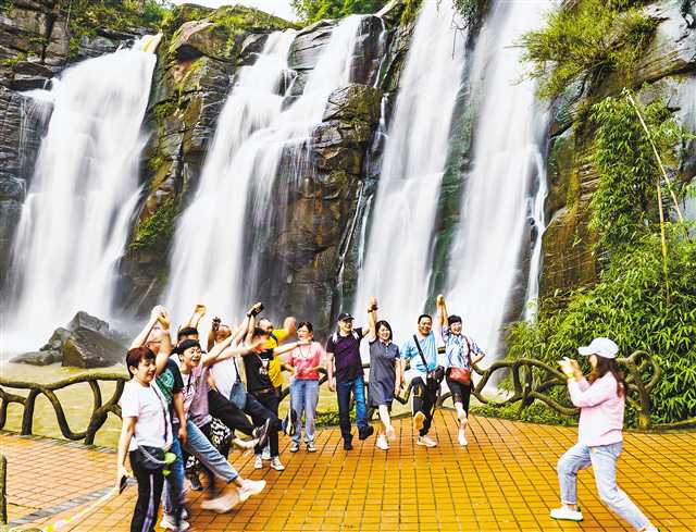 6月3日,游客在萬盛經開區青山湖瀑布賞景游玩。端午假期,眾多市民選擇就近出游,享受假日時光。特約攝影 曹永龍/視覺重慶