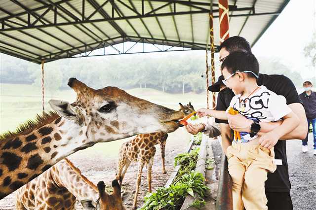 6月4日,永川區重慶樂和樂都主題公園野生動物世界,游客正在喂長頸鹿。特約攝影 陳仕川/視覺重慶