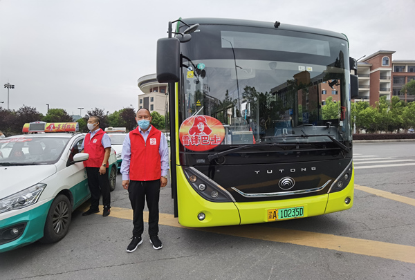 活動現場,張貼著“愛心送考”標志的出租車、大巴車和警用車整裝待發,準備為考生提供免費服務。