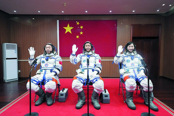 神舟十四號航天員出征,陳冬(中)、劉洋(右)、蔡旭哲開啟為期6個月的飛行任務。新華社發