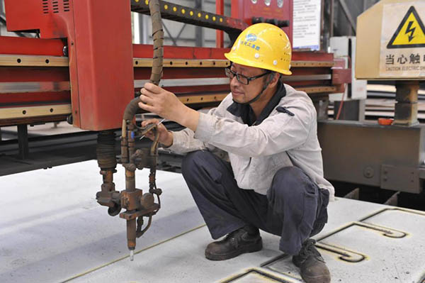 除了普通的檢修保養,郭志渝還帶領他的班組,對車間設備大膽進行創新改造,使它更貼近、更適用于生產:很多焊工反映廠里懸臂雙絲埋弧焊機操作起來極其不順手,郭志渝在經過仔細研究后果斷將懸臂機頭拆卸下來重組,并將控制機改良到中間位置,不僅保留了原有功能,對于焊接大型H型鋼、十字鋼也十分方便。