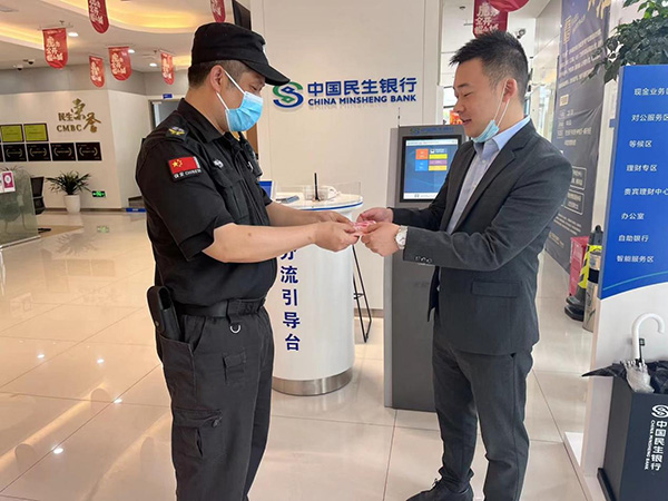 此前,宋明峰在營業廳門口對來網點人員進行體溫測量、掃碼等疫情防控工作時,發現大門口臺階處遺落一疊百元鈔票。于是立即通過對講機通知監控室值班隊員查看監控錄像,追尋失主行走軌跡。