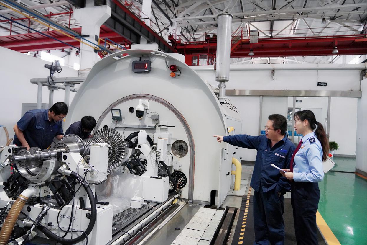 重通透平技術股份有限公司工作人員向重慶經開區稅務人員介紹高速旋轉部件質量檢測與超速試驗系統運轉情況。 歐陽蕾攝