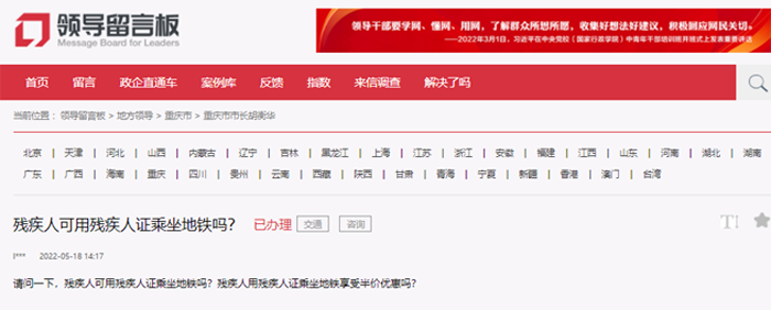 人民網重慶6月11日電 (陳琦)“請問一下,殘疾人可以用殘疾人證乘坐地鐵嗎?殘疾人用殘疾人證乘坐地鐵享受半價優惠嗎?” 近日,有群眾在人民網“領導留言板”上向重慶市市長胡衡華留言咨詢。【留言原文鏈接】