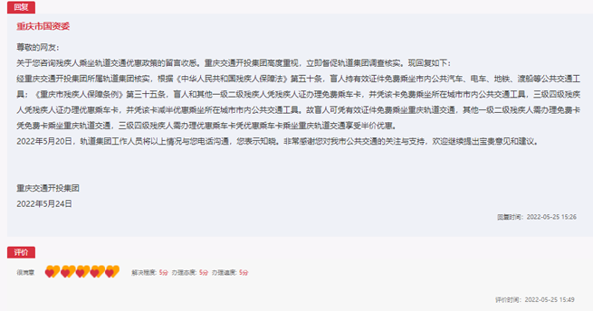 收到留言后,重慶市國資委及時轉重慶交通開投集團核查辦理,5月25日,就網友提出的問題進行了詳實回復。