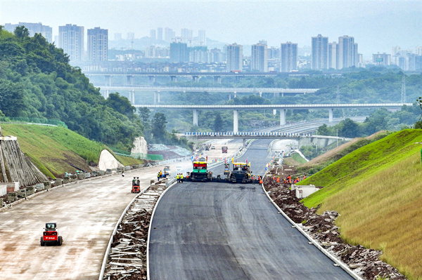 6月13日,科學大道(原快速路一縱線)北碚段正在鋪設瀝青路面,標志著該段道路工程已進入收尾階段。
