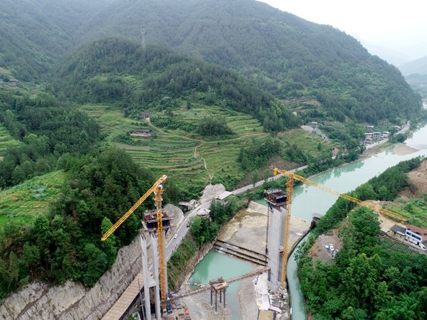 當日一大早,位于重慶市云陽縣江口鎮金子村的湯溪河大橋施工現場一片繁忙,頭戴安全帽、身穿反光背心的施工人員或焊接鋼筋,或操作大型設備;項目業務部門進行模板、預應力筋驗收和安全技術交底……