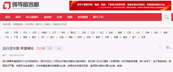 原來,2021年9月22日,這名來自涪陵區青羊鎮吳家村六社的村民在人民網“領導留言板”進行了求助。“我社唯一的出行道路由村民集資修建,有十多年了,由于彎急坡陡,路面損壞嚴重,車輛無法全線通行,本來希望趁惠農政策硬化此路,但現在依然是泥巴路,請領導們幫我們硬化此路。”