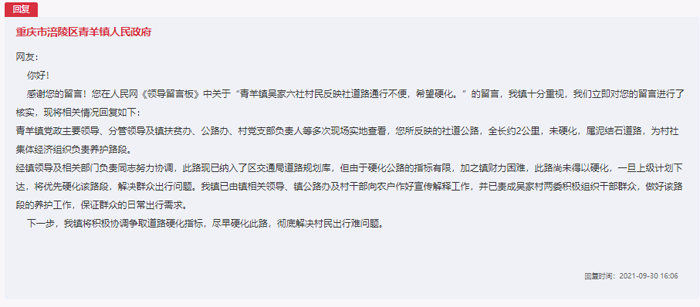 收到留言后,重慶市涪陵區青羊鎮人民政府對群眾反映的問題高度重視,第一時間進行了核實。 “青羊鎮黨政主要領導、分管領導及鎮扶貧辦、公路辦、村黨支部負責人等多次現場實地查看,您所反映的社道公路,全長約2公里,未硬化,屬泥結石道路,為村社集體經濟組織負責養護路段。”2021年9月30日,涪陵區青羊鎮政府在給群眾的回復中說道。經努力協調,群眾反映道路納入了涪陵區交通局道路規劃庫,一旦上級計劃下達,將優先硬化該路段,解決群眾出行問題。