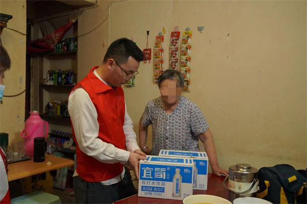 志愿者為獨居老人送來愛心飲用水。甘靖雯攝
