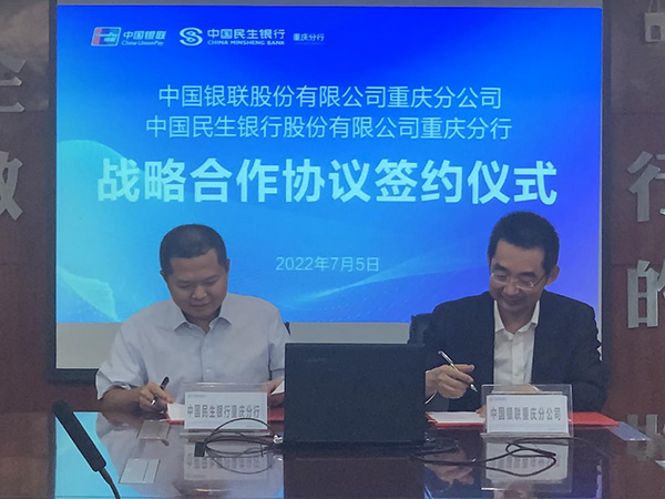7月5日,中國民生銀行重慶分行與中國銀聯重慶分公司舉行戰略合作協議簽約儀式。