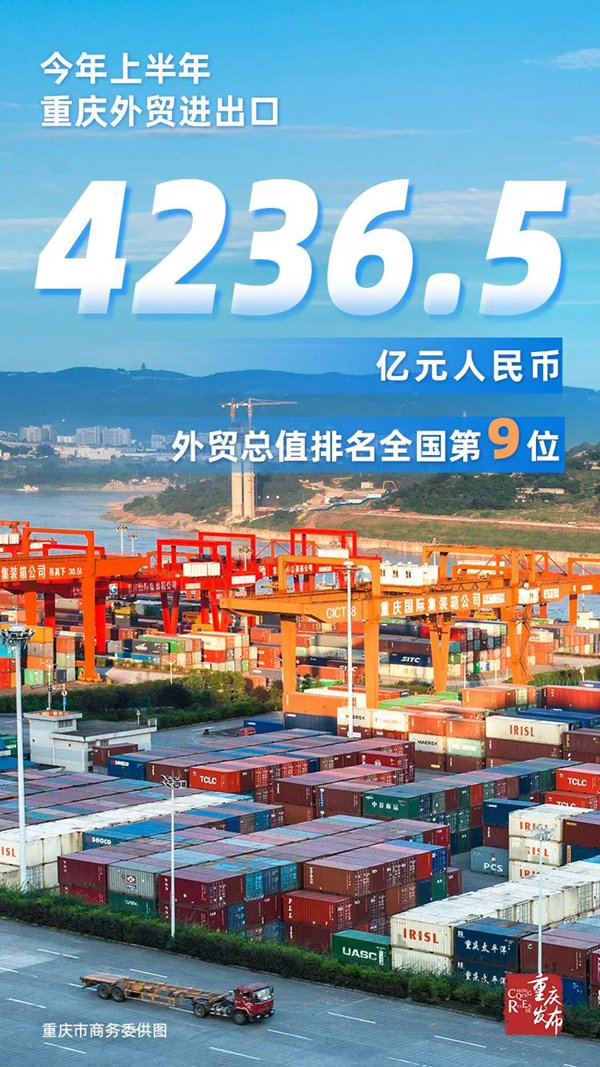 據海關統計,今年上半年,重慶外貿進出口4236.5億元人民幣,較去年同期增長12.5%,高于全國整體增幅3.1個百分點。其中,出口2769.9億元,增長19.5%;進口1466.6億元,增長1.3%。重慶市外貿總值在全國排名第9位。