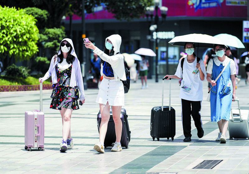 2022年8月1日,解放碑步行街,游客行走在烈日下。