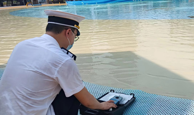 8月5日,衛生監督員正在檢查泳池水質。戴軍攝