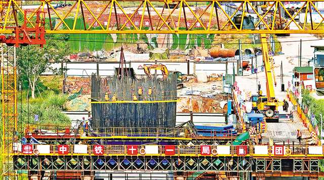8月5日,南岸區廣陽灣大橋施工現場,中鐵職工正冒著酷暑加緊進行主橋墩鋼筋捆扎。