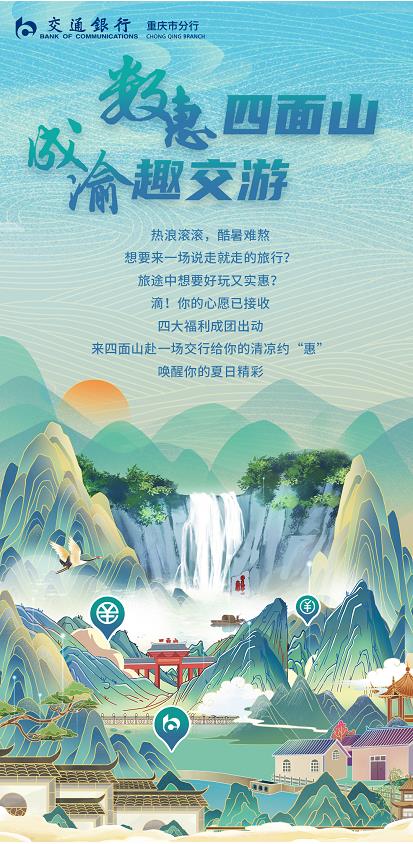 四面山景區位于重慶市江津區四面山鎮,距重慶主城130公里,擁有世界自然遺產丹霞地貌,夏天溫度宜人,是川渝人民喜愛的避暑納涼之地。為支持四面山文旅產業發展,夯實旅游基礎設施建設及周邊金融服務水平,交行重慶市分行運用金融科技進一步拓展數字人民幣應用場景,在景區及周邊打造數字人民幣“先行先試”范例。