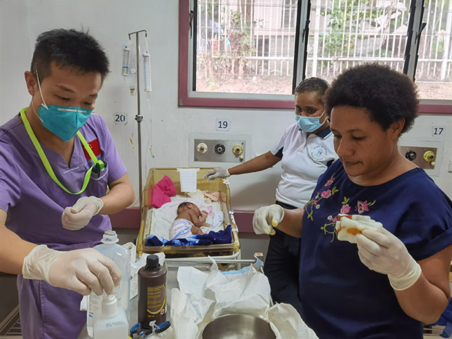 劉振球在巴新莫港醫院救治患兒。受訪者供圖