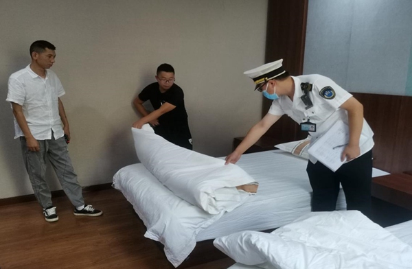 執法人員檢查某旅店布草清洗消毒情況。石柱縣衛生健康綜合行政執法支隊供圖
